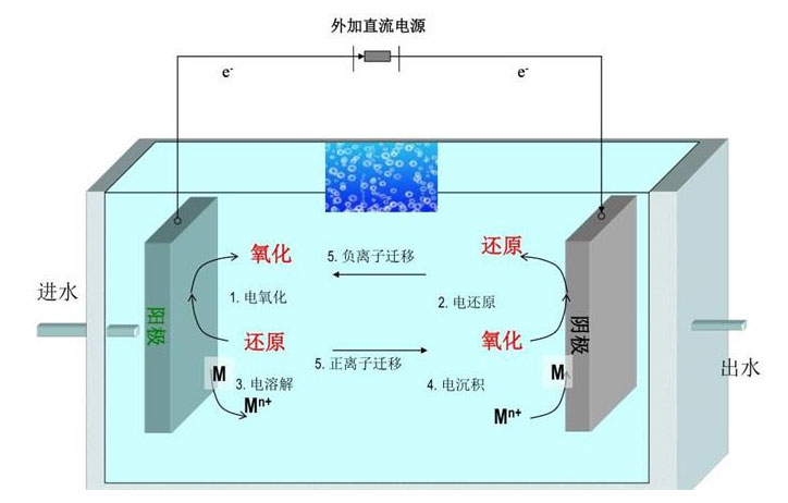 通过外加电场的作用,电极发生电化学反应,金属阳极产生具有絮凝特性的阳离子(如Fe2+和Al3+等),并在水体中发生水解、聚合,形成一系列氢氧化物或多核羟基络合物,通过吸附、絮凝或沉淀作用去除水体中的污染物的过程。